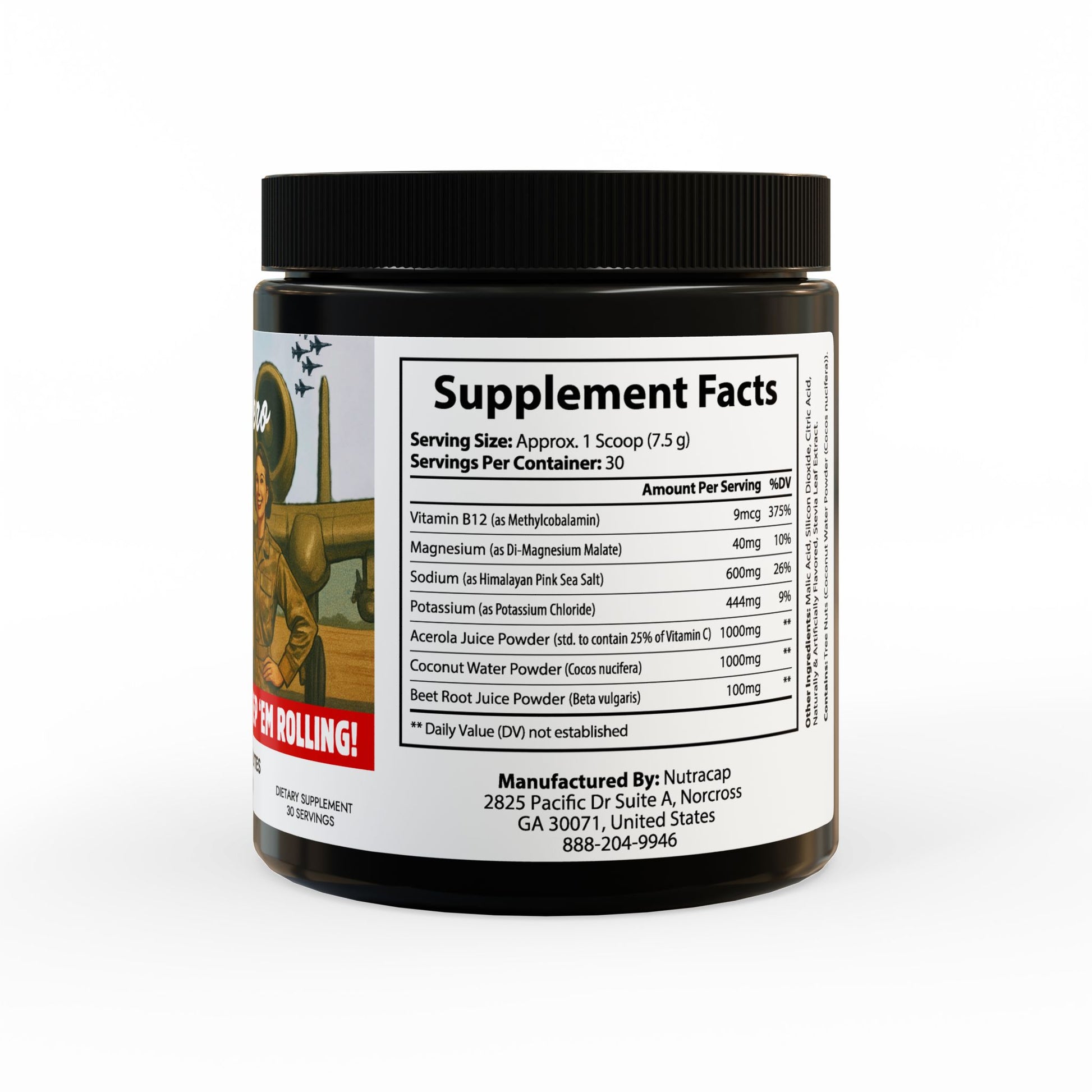 Vitamin B12 (as Methylcobalamin), Magnesium (as Di-Magnesium Malate), Sodium (as Himalayan Pink Sea Salt), Potassium (as Potassium Chloride), Acerola Juice Powder (std. to contain 25% Vitamin C), Coconut Water Powder (Cocos nucifera), Beet Root Juice Powder (Beta vulgaris).